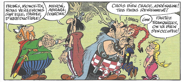 Adrénaline est moderne au goût des bobos urbains : elle a « deux papas ». Et vlan dans les gencives des irréductibles ploucs gaulois rétrogrades ! Lors de leur arrivée au village, les deux lieutenants de Vercingétorix donnent pour consigne à leur fille adoptive : « sois bien sage, Adrénaline. Tes papas reviennent ! » Les personnages efféminés sont peu enclins à la violence : l’un pleure comme une madeleine et l’autre fait montre d’une exubérance excessive. On n’ose pas rire devant ce couple étrange, ce serait homophobe. C’est bien là un des problèmes avec cet album et l’idéologie progressiste : on rit peu.