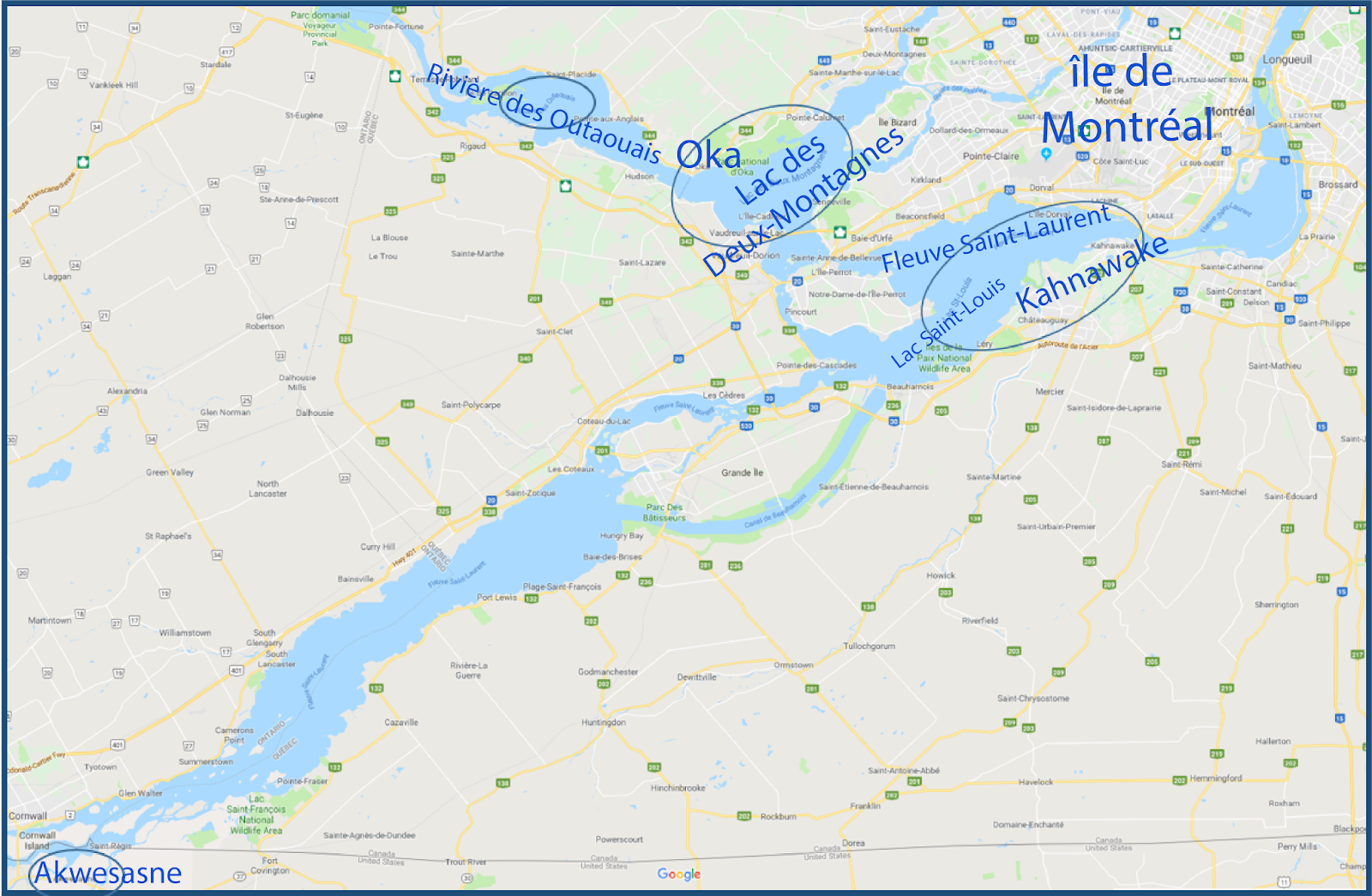 « Kanesatake est une réserve enclavée dans la municipalité d’Oka à la confluence de la rivière des Outaouais et du lac des Deux-Montagnes. Sa géographie représente un atout considérable pour des trafics de toutes sortes. Les voies d’eau offrent les liaisons les plus sûres pour qui sait y naviguer de jour ou de nuit. Ce territoire de 670 kilomètres carrés est devenu un site de transit pour les contrebandiers. Rien d’étonnant à ce que les Mohawks en réclament la souveraineté. » (p. 88)