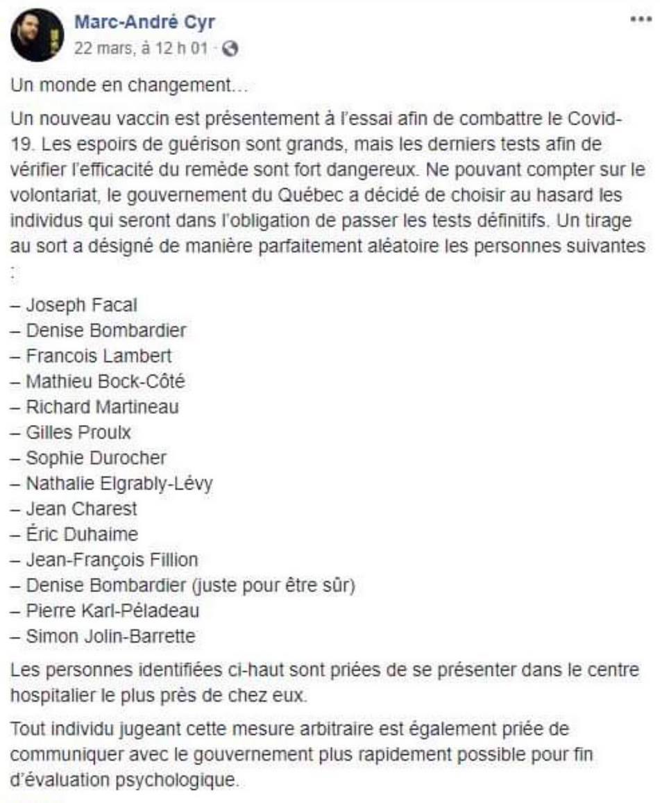 Oui, ce type de publication, celle de Cyr, celle de Dubé juste après (lui qui souhaite que Martineau attrape le coronavirus), oui, tout cela nous détourne de l’essentiel. Et ça nuit à tout le monde.