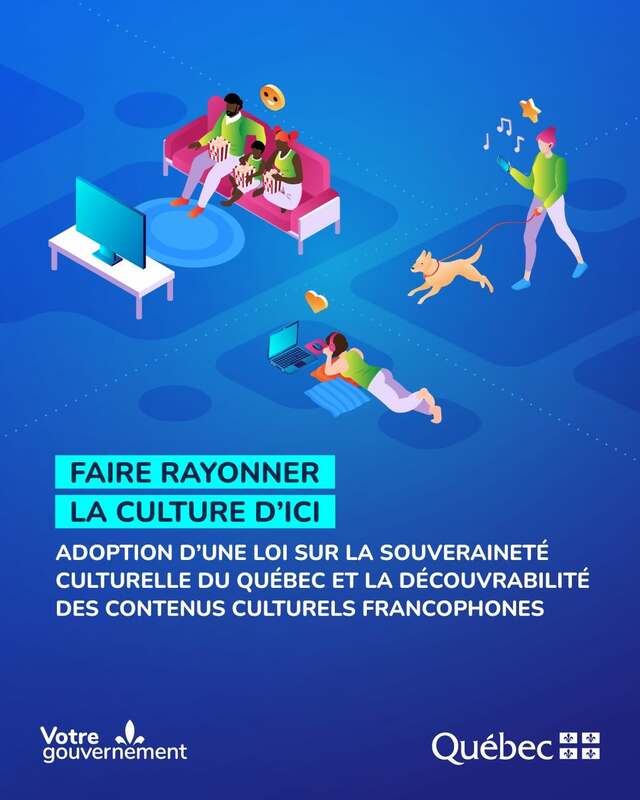 Car en contrepartie au Québec, nous possédons toute la gamme des productions culturelles bien de chez nous qui nous reflètent en tant que nation bien distincte de toutes les autres: nos chaînes télé, nos téléséries, nos films, nos chaînes de nouvelles en continu, nos stations de radio (à Québec, toutes les fréquences de la bande FM sont occupées), notre star-système très élaboré avec de nombreuses personnalités et vedettes pour chaque génération, nos artistes musicaux, nos artistes en art visuel, nos acteurs et comédiens, nos humoristes, nos journaux, nos revues, nos livres (incluant ceux pour enfants), même les publicités mettant en vedette nos artistes (à noter que tous les éléments qui précèdent sont au pluriel, l'abondance de l'offre est la norme et non l'exception). En un mot, tout ça, c'est notre belle, riche et vaste culture bien vivante et aux mille facettes, à travers laquelle nous déambulons et circulons toute la journée pour notre plus grand bonheur et enrichissement.