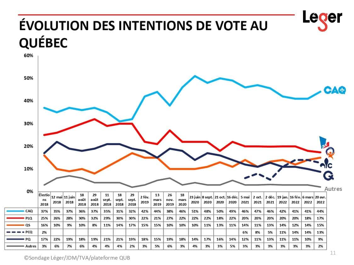 Loin d’en faire les frais, les troupes de François Legault ont même gonflé leurs appuis depuis le mois dernier pour atteindre 44 % des voix, révèle un sondage Léger réalisé du 14 au 17 avril.