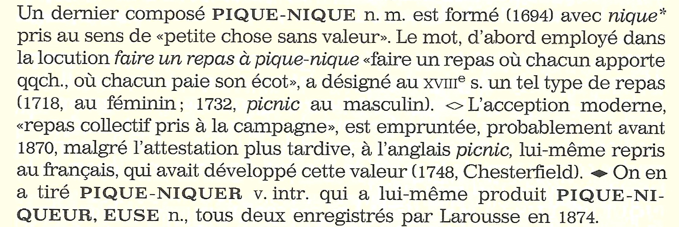 Le mot « pique-nique » semble être interdit en raison de rumeurs sur Internet selon lesquelles ce mor serait associé aux lynchages de noirs aux États-Unis (« pick a nigger »). En réalité le mot pique-nique vient du mot français « pique-nique », un terme attesté dès 1694 et utilisé pour décrire un rassemblement social dans lequel les participants ont chacun contribué avec une portion de nourriture (chacun pique une nique [un peu]). Le sens est ensuite évolué pour désigner un repas champêtre, généralement pris sur l’herbe et en commun. Stendhal écrivait ainsi en 1842 « Il faisait chaud, cet été-là, et les plaisirs champêtres étaient à la mode (…) souvent (…) on faisait des pique-niques à Maisons, à Meudon, à Bissy » (Lamiel).