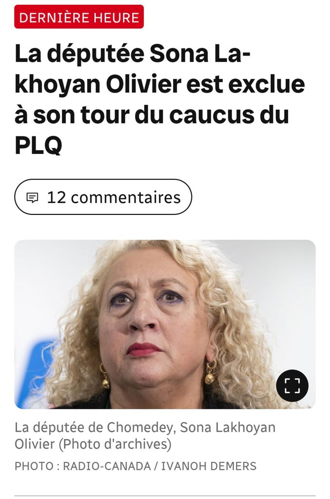 Ce dernier rappelle la nouvelle, sortie par Antoine Robitaille, selon laquelle le bureau de circonscription de la députée immigrée étrangère libanaise Sona Lakhoyan Olivier avait été mis sous tutelle en 2023.